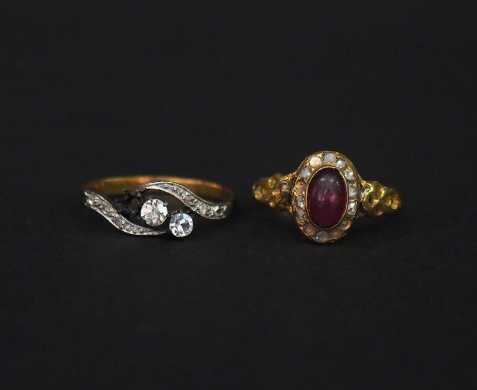 Ensemble comprenant : - une bague en or jaune, sertie en son centre d'une pierre rose en cabochon entourée de petits éclats de diamant. La monture, à décor ajouré. TDD. 53 (manque quelques petits éclats de diamants) - une bague de forme stylisée en or jaune, sertie de deux pierres à l'imitation du diamant et de petits éclats de diamant sur la monture mouvementée. TDD. 55 (manque une pierre) Poids tel. 4,85 g