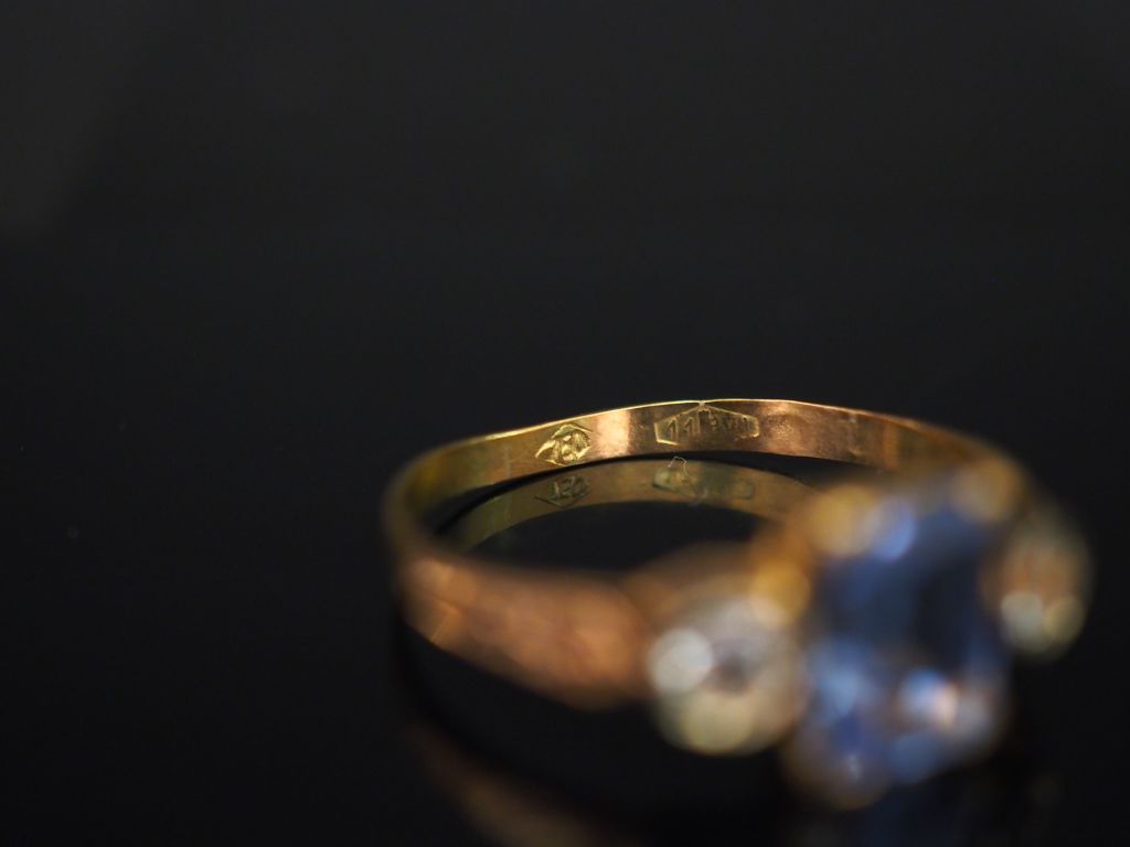 Ensemble comprenant : - une bague en or jaune, sertie en son centre d'une pierre bleue épaulée de pierres à l'imitation du diamant. TDD. 61 - une bague de forme marquise en or jaune, sertie de pierres fantaisie. TDD. 55 Poids tel. 5,38 g