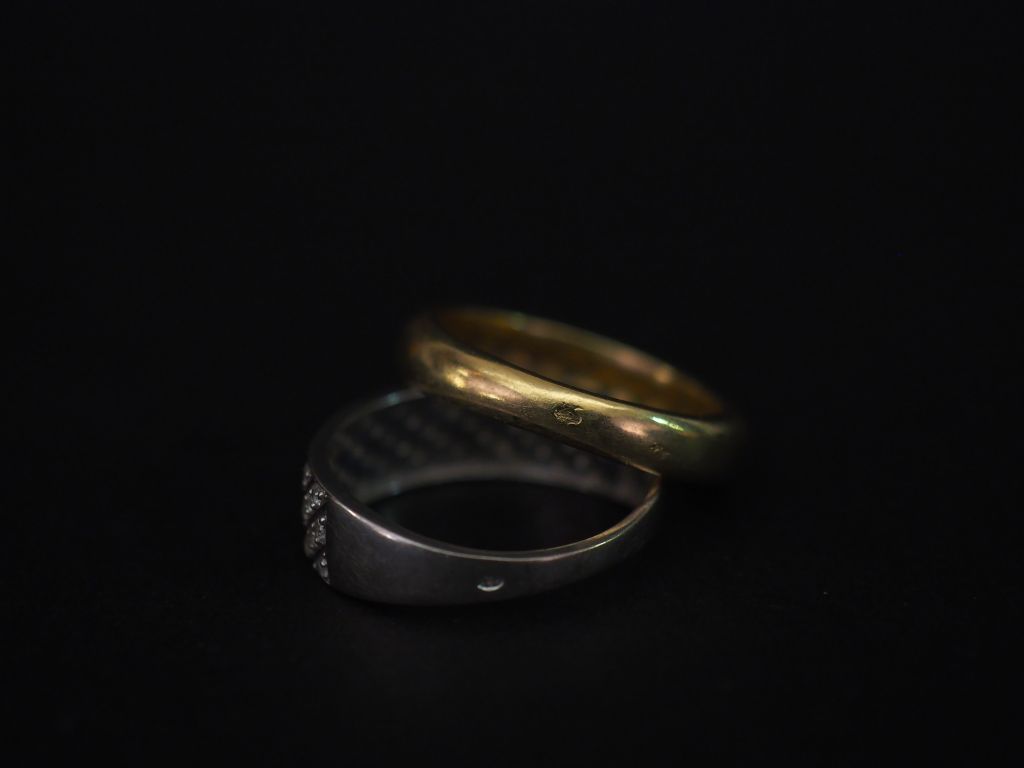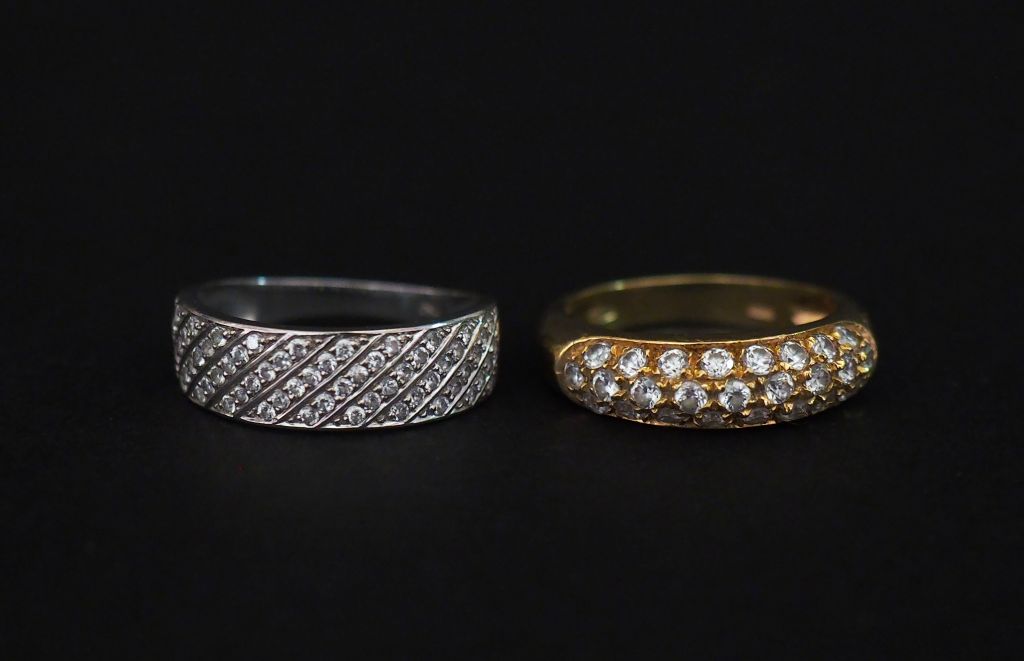 Ensemble comprenant : - une bague jonc en or blanc, sertie d'un pavage à l'imitation du diamant. TDD. 58 - une bague jonc en or jaune, sertie de pierres à l'imitation du diamant. TDD. 57 - une bague ajourée de forme stylisée, sertie d'une pierre bleue. TDD. 56 1/2 (manques) - une paire de puces d'oreilles en or jaune et pierre à l'imitation du diamant. Poids tel. 13 g