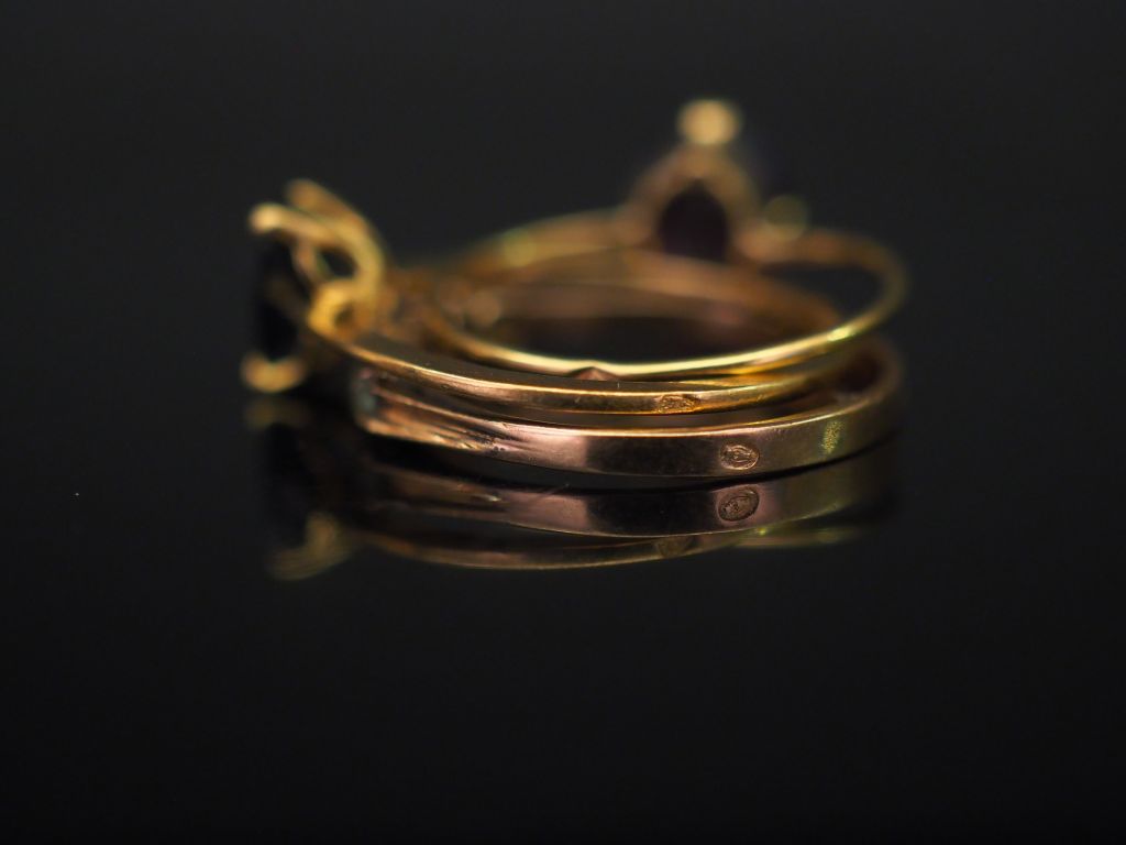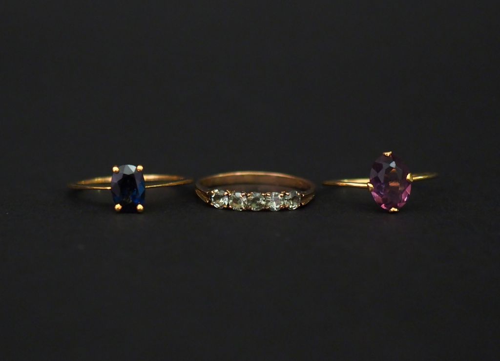 Ensemble comprenant : - une bague jonc en or jaune, sertie d'une ligne de cinq pierres de couleur. TDD. 52 - une petite bague en or jaune, sertie en son centre d'une améthyste (?). TDD. 50 - une bague en or jaune, sertie en son centre d'une pierre bleue. TDD. 51 Poids tel. 3,41 g