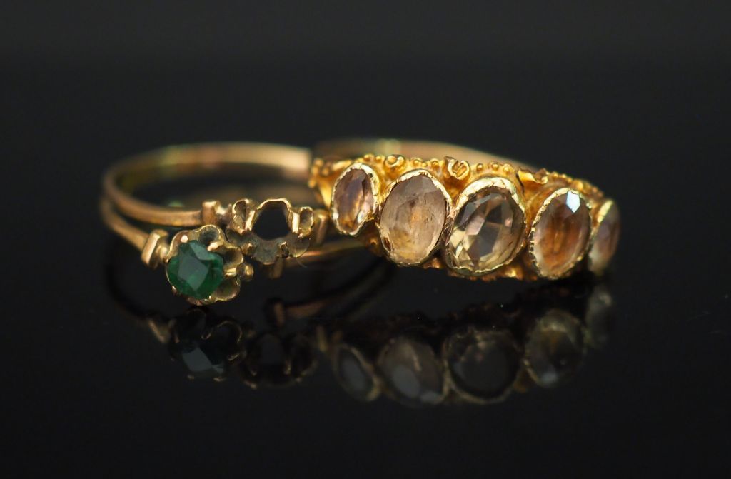 Ensemble comprenant : - une bague jonc en or jaune, sertie d’une ligne de cinq pierres. TDD. 55 - une bague Toi Moi en or jaune, sertie d’une pierre verte. TDD. 54 (manque une pierre) Poids tel. 2,79 g