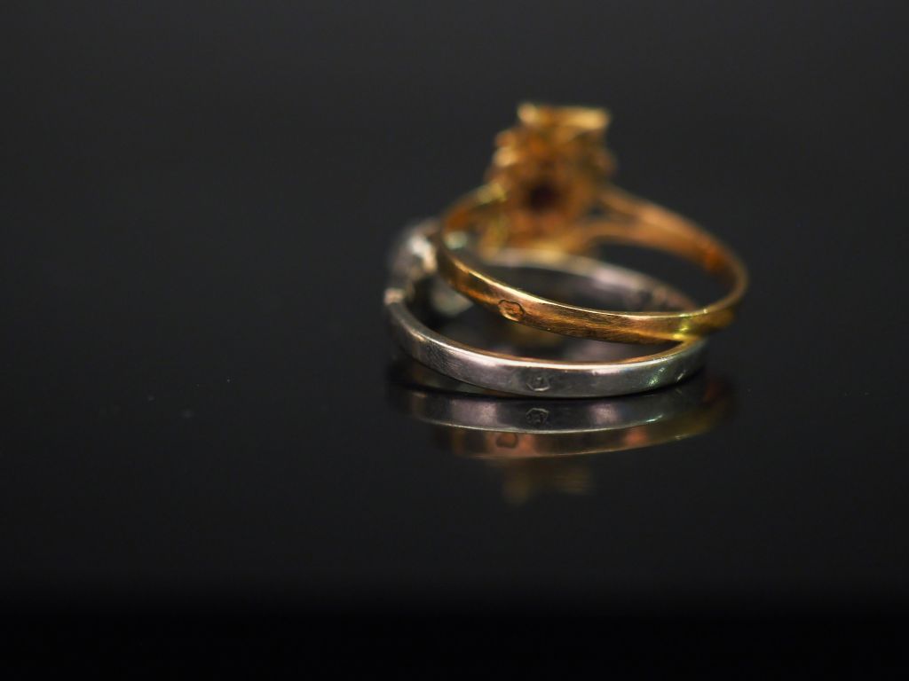 Ensemble comprenant : - une bague solitaire en platine, sertie en son centre d'un petit diamant de 0,04 ct environ. TDD. 48 - une petite bague en or jaune en forme de nœud, sertie en son centre d'une pierre de couleur et de quatre éclats à l'imitation du diamant. TDD. 50 Poids tel. 3,03 g