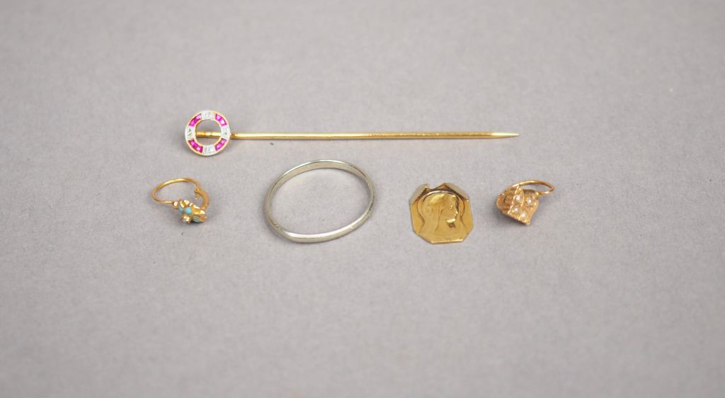 Ensemble comprenant : - une boucle d'oreille en or jaune et perles. Poids tel. 0,42 g - une boucle d'oreille en or jaune et émail bleu ciel. Poids tel. 0,30 g ((petits sauts) - une médaille en or jaune. Poids. 0,61 g (accident) - une alliance en or blanc. TDD. 55 Poids. 1,34 g (déformée) - une épingle à cravate en or jaune, à décor d'un cerle orné de pierres roses calibrés et de petits éclats de diamants. Poids tel. 1,38 g (petit manque)