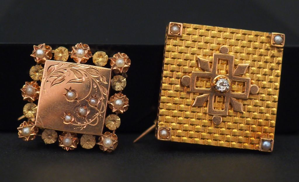 Ensemble comprenant : - une broche carrée Napoléon III en or jaune, à décor en son centre d'une croix sertie d'un petit diamant. Les angles sertis d'une perle. 2,5 x 2,5 cm - une broche Napoléon III en or jaune, sertie de perles, à décor de fleurs. 2,3 x 2,3 cm Poids tel. 8,19 g