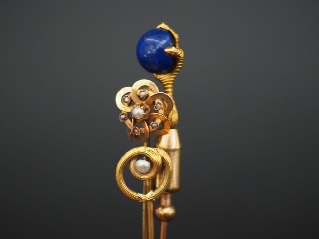 Ensemble comprenant : - une épingle à cravate en or jaune, à décor d'une pate d'aigle tenant une pierre bleue en cabochon. Long. 9 cm Poids tel. 4,58 g - une épingle à cravate en or jaune et perle, à décor de tiges enrubannées. Long. 6,5 cm Poids tel. 1,36 g - une épingle à cravate en or jaune et perles. Long. 6,9 cm Poids tel. 1,22 g (pique en métal)