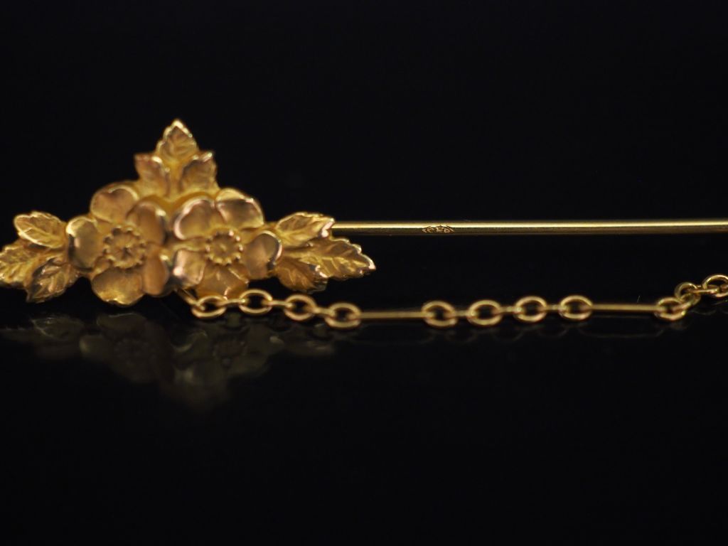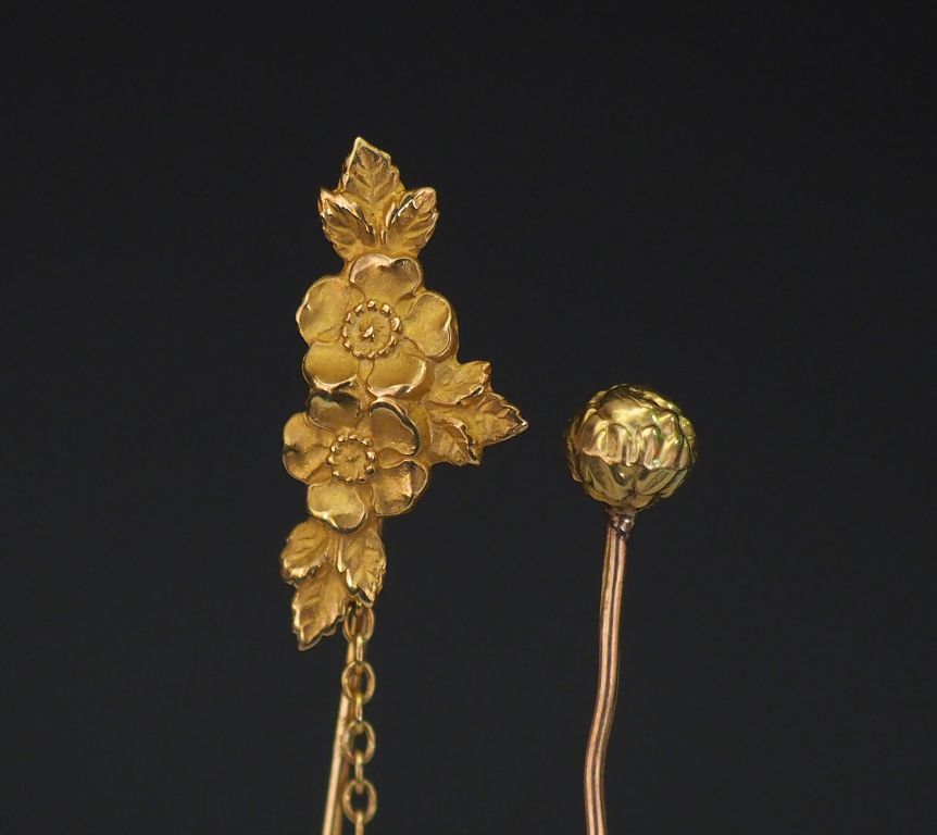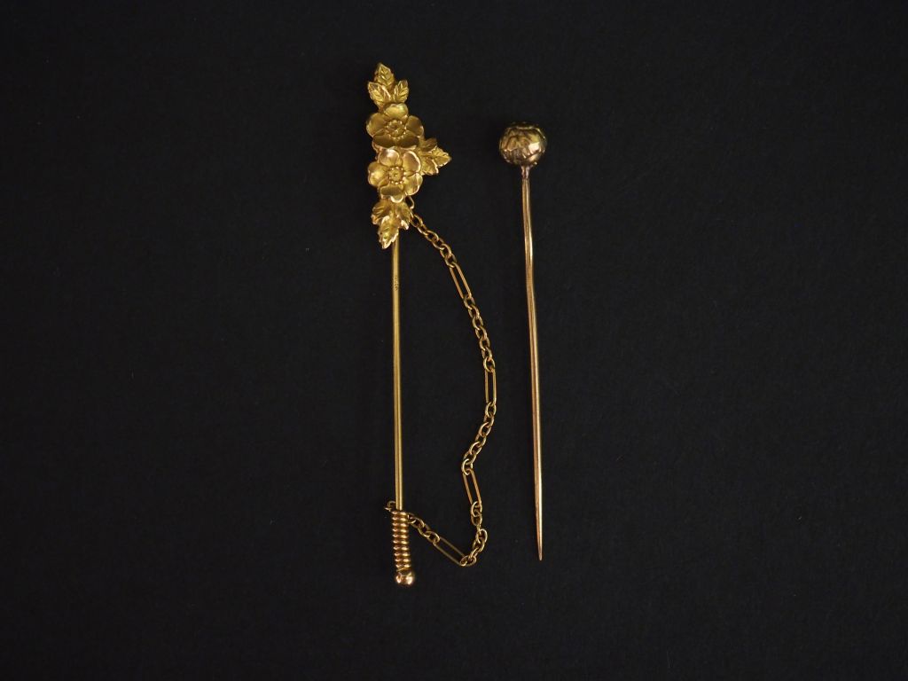 Ensemble comprenant : - une épingle à cravate en or jaune, à décor de fleurs. H. 5,5 cm - une épingle en or jaune, à décor d'une boule à son extrémité. H. 5 cm (pique légèrement tordue) Poids. 2,13 g
