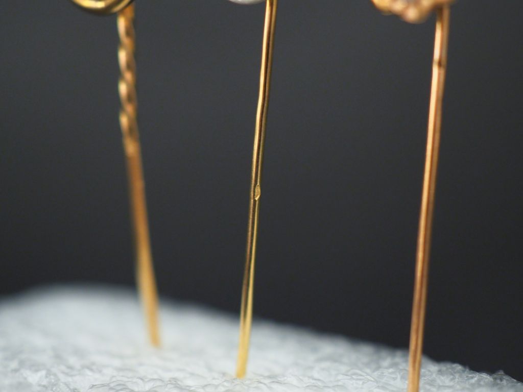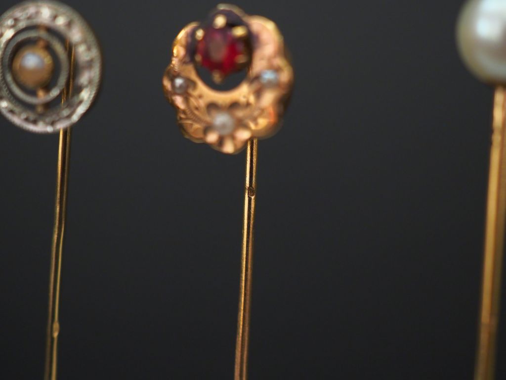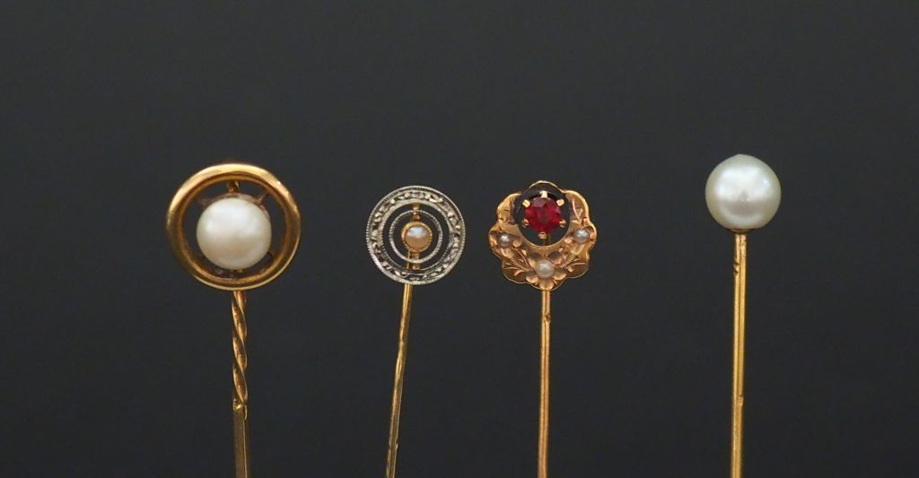 Ensemble comprenant : - une épingle à cravate en or jaune, sertie en son centre d’une perle. Long. 6,6 cm - une épingle à cravate en or jaune et perle. Long. 6,5 cm - une épingle à cravate en or jaune et perle, à décor d’un cercle orné d’une couronne de feuilles. Long. 6,2 cm - une épingle à cravate Napoléon III en or jaune, pierre de couleur et perles, à décor de fleurs. Long. 5,5 cm Poids tel. 5,75 g