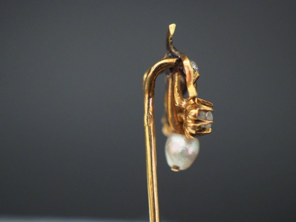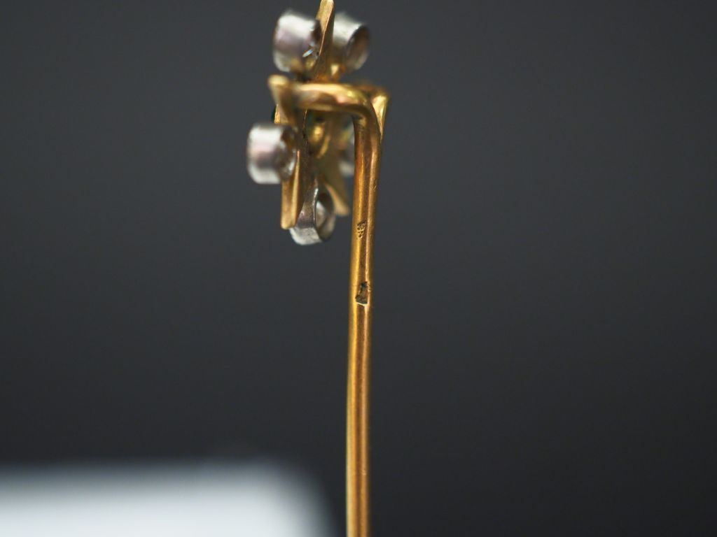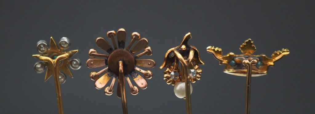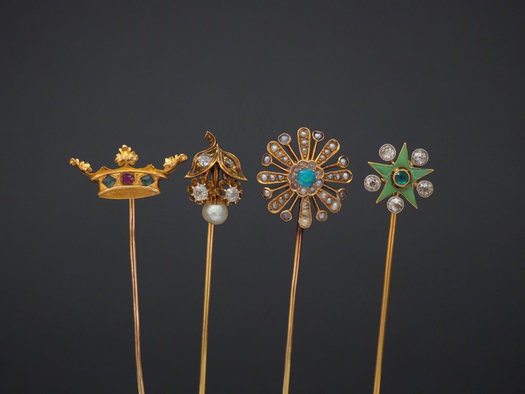 Ensemble comprenant : - une épingle en or jaune, à décor d'une couronne sertie d'une pierre rose épaulée d'une pierre verte. Long. 7,9 cm - une épingle Napoléon III, à décor d'une fleur sertie en son centre d'un turquoise en cabochon et de perles sur les pétales. Pique en or jaune 18k. Motif central en or jaune 9k. Long. 7,1 cm (petits manques) - épingle en or jaune, à décor de branchage fleuri sertie de petits diamants taillés en rose et d'une perle. Long. 6,6 cm - épingle en or jaune et émail vert, sertie de cinq petits diamants et d'une pierre verte, à décor d'étoile. Long. 7 cm (très légers accidents à l'émail) Poids tel. 11,36 g