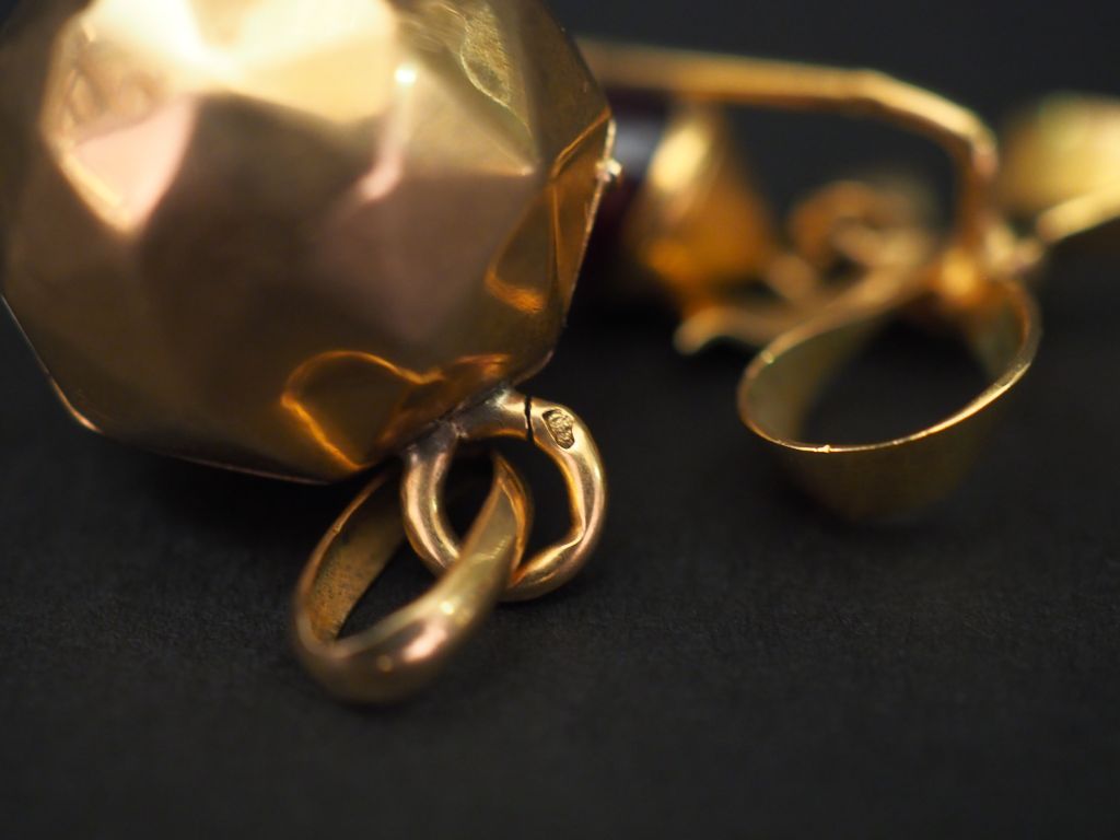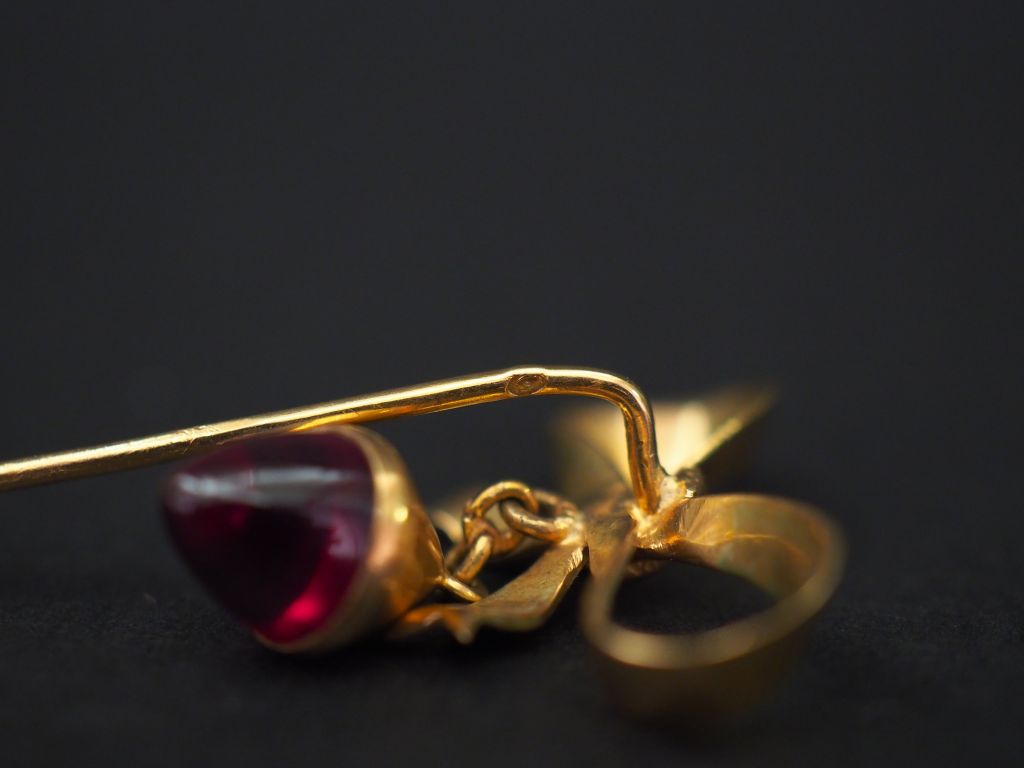 Ensemble comprenant : - une épingle en or jaune en forme de nœud de ruban, à décor d'une pendeloque en forme de gland serti d'une pierre de couleur. Long. 3,7 cm Poids tel. 3,45 g - un pendentif en or jaune, en forme de boule facetté. Poids. (sans le verre) : 4,30 g