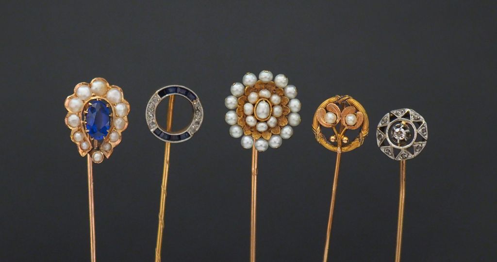 Ensemble comprenant : - une épingle Napoléon III en or jaune et perles. Long. 7,9 cm - une épingle de style Art Nouveau deux tons d'or et perles, à decor de fleurs et tiges enrubannées. Long. 6,6 cm - une épingle en or jaune, sertie en son centre d'une pierre bleue entourée de perles. Long. 6,8 cm - une épingle en or jaune, sertie de pierres bleues calibrées et éclats de diamant. Long. 6,6 cm Poids tel. 8,21 g On y joint une épingle sertie de pierres à l'imitation du diamant. Tête en or jaune. Tige en métal. Poids tel. 1,44 g
