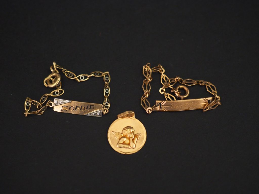 Ensemble comprenant : - une gourmette deux tons d'or et émail noir, marquée "Sophie". Long. 13 cm (sauts d'émail, fermoir accidenté) - une gourmette en or jaune, marquée "Laetitia". Long. 13,5 cm - une petite médaille religieuse en or jaune figurant un angelot. Diam. 1,4 cm Poids. 4,32 g