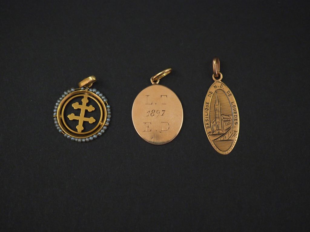 Ensemble comprenant : - une médaille religieuse ovale en or jaune, figurant Notre Dame de Lourdes. Décor double faces. H. 2,3 cm - une médaille religieuse en or jaune, à décor de la croix de Lorraine. Le pourtour, à décor de perles. Diam. 1,6 cm Poids tel. 2,03 g On y joint une médaille religieuse en métal doré et émail polychrome figurant la Vierge en Majesté. (sauts d'émail)