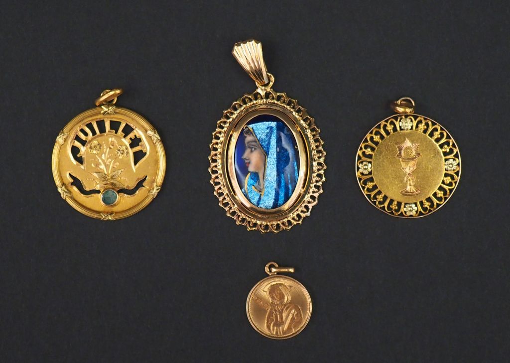 Ensemble comprenant : - une médaille religieuse ronde en or jaune, à décor de calice. Le pourtour à décor ajouré de fleurs. Diam. 2 cm - une médaille religieuse en or jaune, figurant un moine. Diam. 1,2 cm - une médaille ronde en or jaune, à décor de tiges enrubannées, de ruban serti d'une petite pierre bleu et marquée "Juillet". Diam. 2,4 cm - un pendentif en or jaune, serti en son centre d'un émail polychrome figurant une jeune femme. 2,8 x 2,3 cm Poids tel. 7,50 g