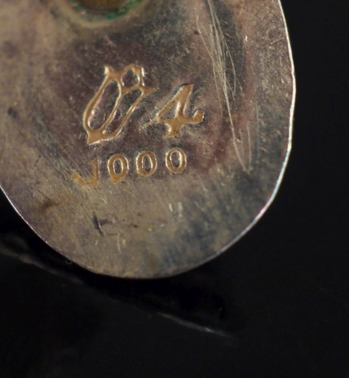 Ensemble comprenant : - une paire de clips d'oreilles ovales en argent et lapis lazuli en cabochon. 2 x 1,5 cm - une paire de clips d'oreilles de forme ovales en argent à décor émaillé polychrome de fleur et rinceaux et sertis de verroteries. 2,2 x 1,5 cm (petits sauts d'émail) - une bague de forme marquise en argent, sertie d'un turquoise. TDD. 54 Poids tel. 15,70 g