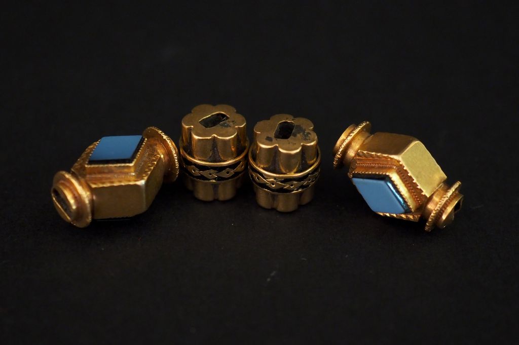 Ensemble comprenant : - une paire de coulants en or jaune et émail noir. Poids. 3,47 g (petits sauts d'émail) - une paire de coulants en or jaune et pierre dure. Poids tel. 4,52 g