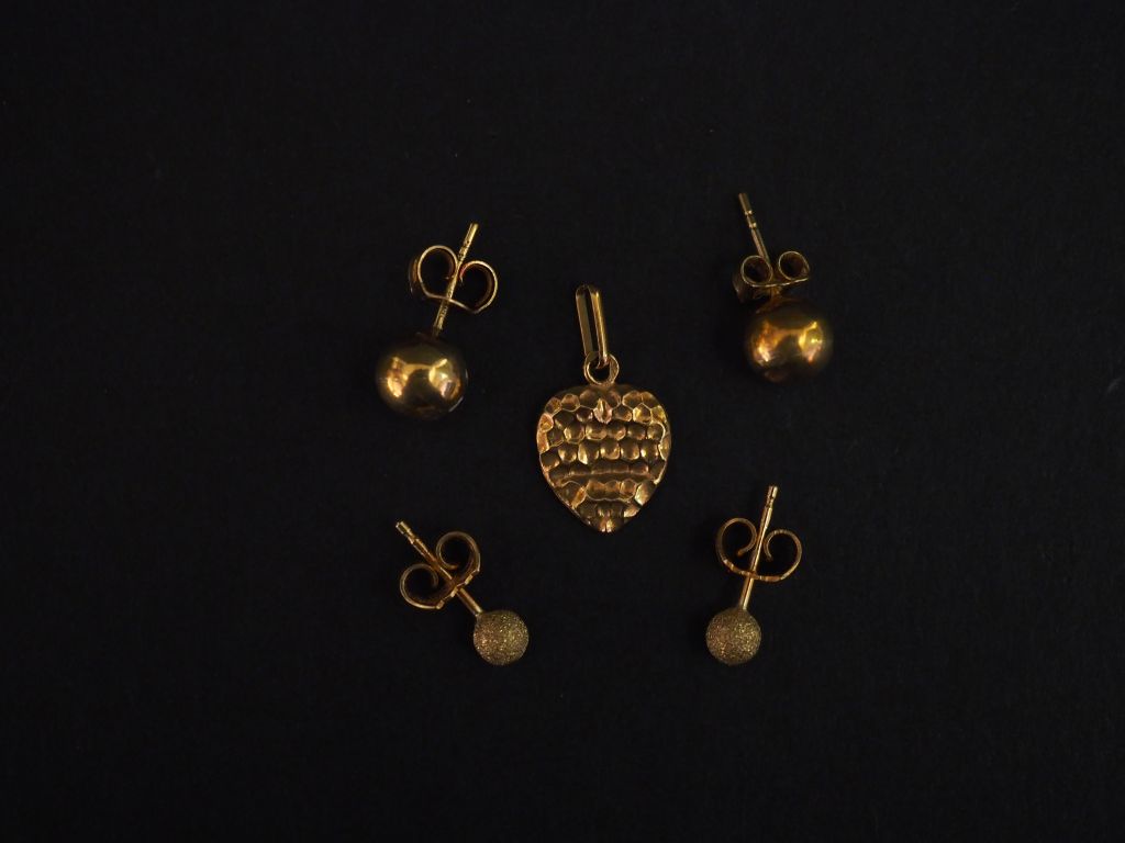 Ensemble comprenant : - une paire de perce-oreilles en forme de boules. (petits enfoncements) - un pendentif en forme de cœur en or jaune, à décor martelé. H. 1 cm - une paire de perce-oreilles en or jaune en forme de boules. Poids. 2,33 g