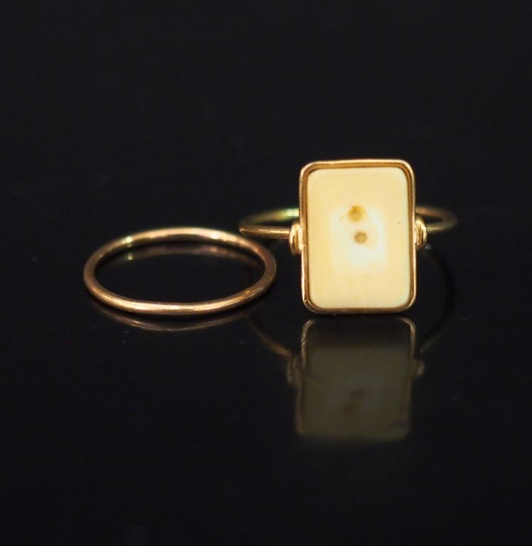 Ensemble comprenant : - une petite bague en or jaune et composition. TDD. 51 - une fine alliance en or jaune. TDD. 44 Poids tel. 2 g