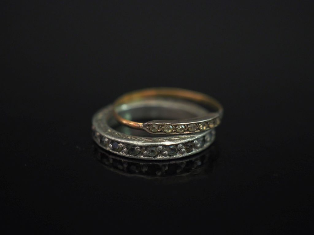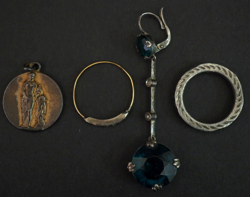Ensemble comprenant : - une petite bague jonc en or jaune 750 et argent, serte d'une petite ligne de pierres à l'imitation du diamant. TDD. 55 Poids tel. 0,78 g (accident) - une médaille en argent figurant une scène à l'antique. Diam. 2 cm Poids. 3,92 g - un perce oreille en argent 800, serti de pierres fantaisie. H. 5,6 cm Poids tel. 3,57 g On y joint une alliance amérciane en métal et pierres fantaisie.