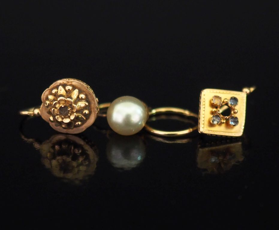 Ensemble comprenant : - une petite créole en or jaune 750. Diam. 1,2 cù - un perce oreille en or jaune 750, serti d'une perle blanche. H. 1,5 cm - un perce oreille en or jaune 750, à décor en son centre d'une fleur. H. 1,8 cm (manque au centre) - un perce oreille en or jaune 750 de forme losangique, serti de pierres fantaisie. H. 1,6 cm (manques) Poids tel. 2,49 g