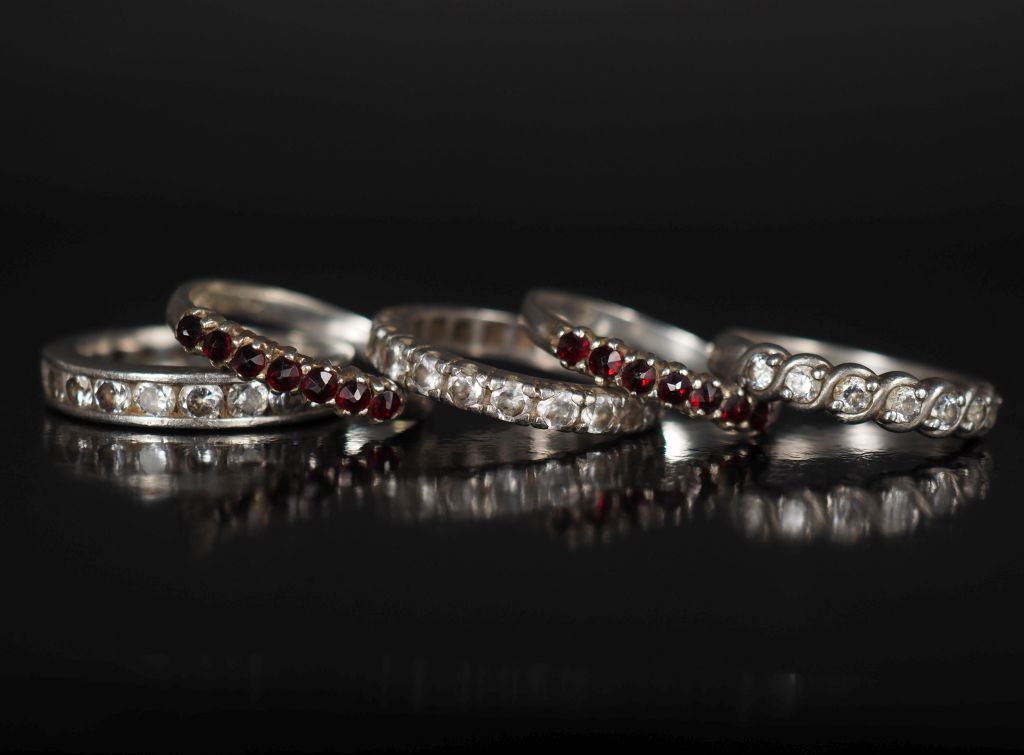 Ensemble de cinq différentes bagues en argent. Comprenant : - une alliance américaine, sertie de pierres à l'imitation du diamant. TDD. 55 - une alliance américaine, sertie de pierres à l'imitation du diamant. TDD. 54 - une demi-alliance américaine, sertie de pierres à l'imitation du diamant. TDD. 56 - deux demi-alliances, serties de pierres de couleur. TDD. 56 Poids tel. 12,53 g