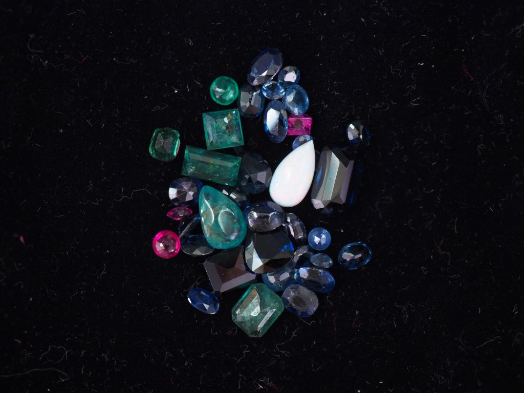 Ensemble de pierres sur papier, comprenant des émeraudes, saphirs, opa...