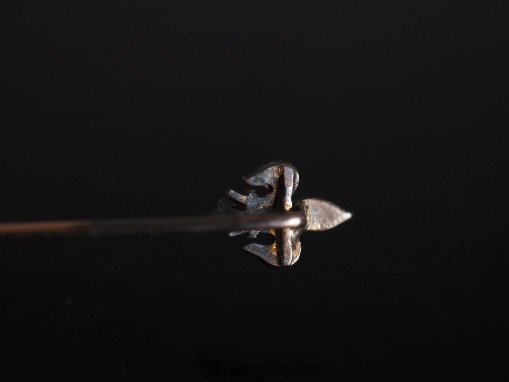 Epingle à cravate en or jaune 750 et argent, à décor d'une fleur de lys sertie d'un petits diamant taillé en rose et de pierres à l'imitation du diamant. Long. 4,9 cm Poids tel. 0,91 g