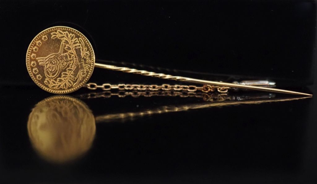 Epingle à cravate en or jaune 750, ornée d'une pièce étrangère en or et agrémentée d'une chainette retrenant un élément en métal. Long. 6,2 cm Poids tel. 3,22 g