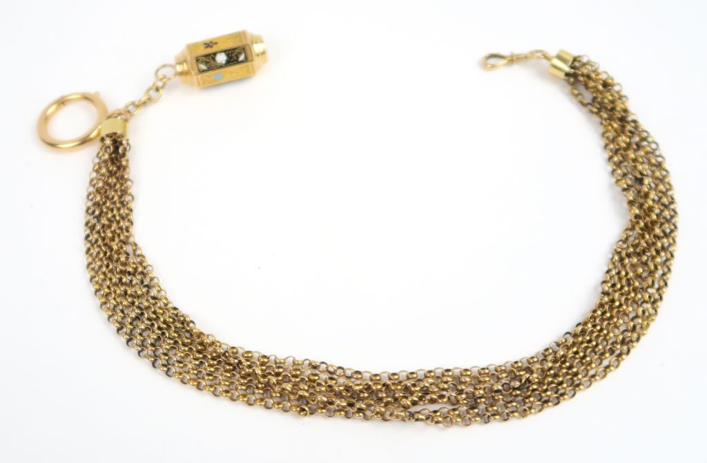 Giletière en or, 7 chaines réunies, avec fermoir et élément en or émaillé. Poids : 28 g