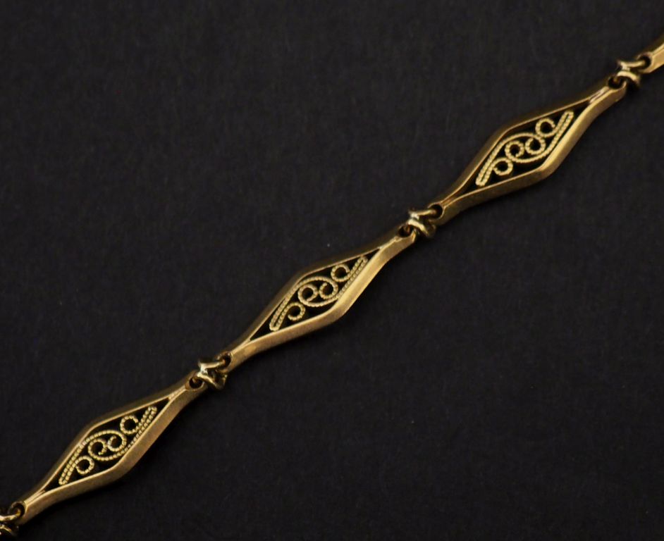 Giletière en or jaune 750, composée de maillons ajourés à décor filigrané, Long. 39 cm Poids. 20,90 g (accidentée)