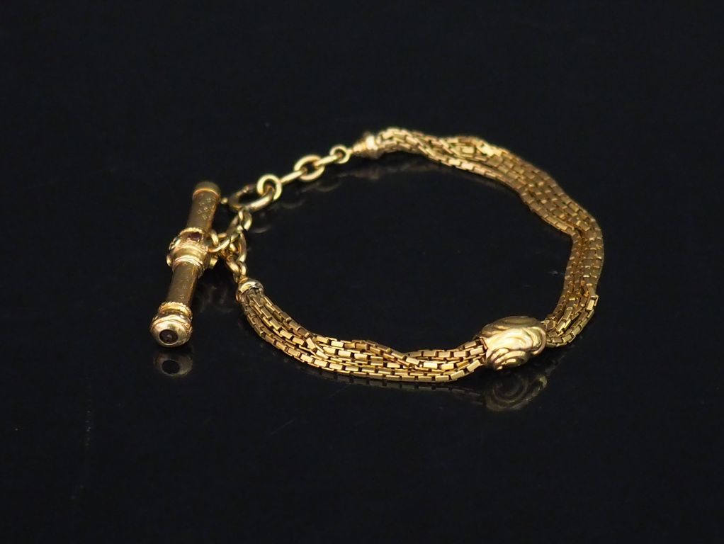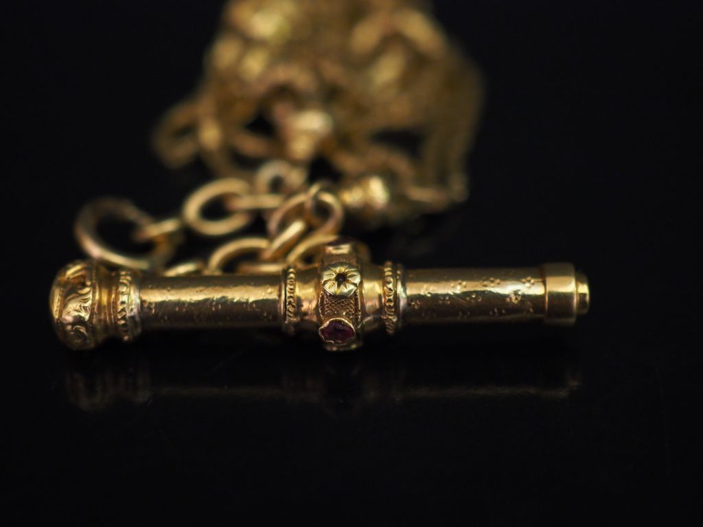 Giletière Napoléon III en or jaune et petites pierres de couleur. Long. 20 cm Poids tel. 21,59 g (petites traces de soudures anciennes)