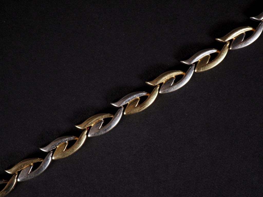 Grand collier deux ors, 750, maillons plats articulés et stylisés. Poids : 33,30 g
