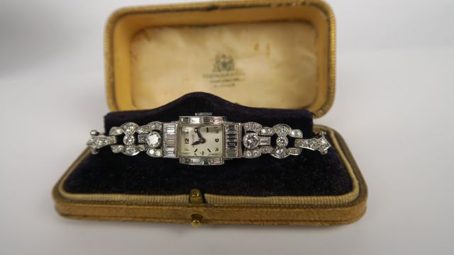 HAMILTON. Montre de dame Art Déco en or 14 carats, boitier et bracelet entièrement sertis de brillants, pour un ensemble de trois carats environ. Poids tel : 28,5 g