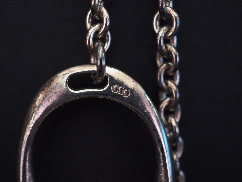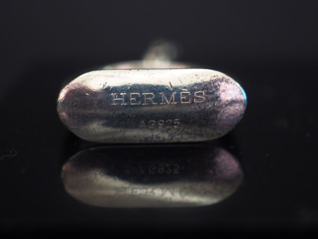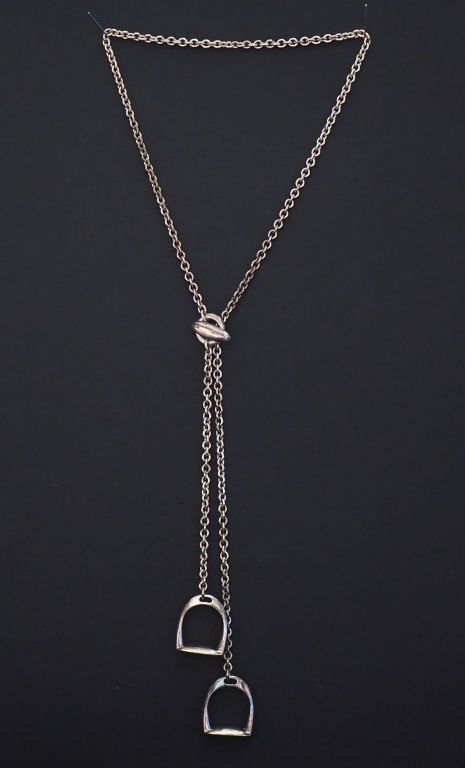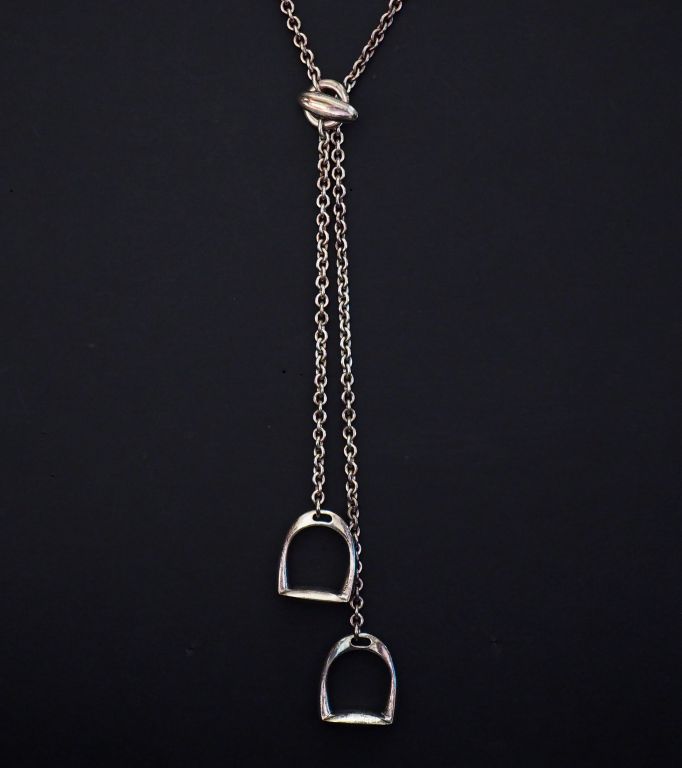 HERMES, Paris. Collier cravate en argent, à décor de deux étriers en pendeloque. Signé. Poids.
