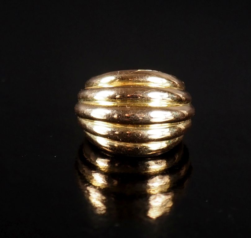 Importante bague dôme en or jaune 750, à décor de godrons. TDD. 61 Poids. 12,16 g