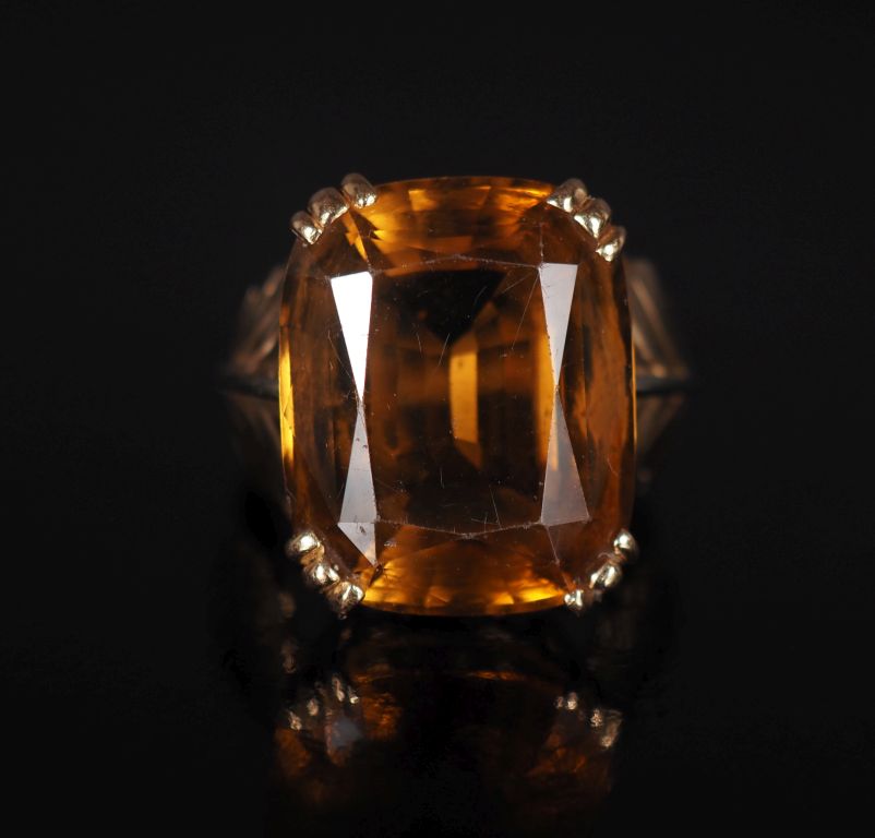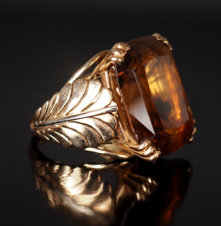 Importante bague en or jaune 750, sertie en son centre d'un quartz. Très jolie monture ajourée, à décor de feuilles. TDD. 54 Poids tel. 15,40 g