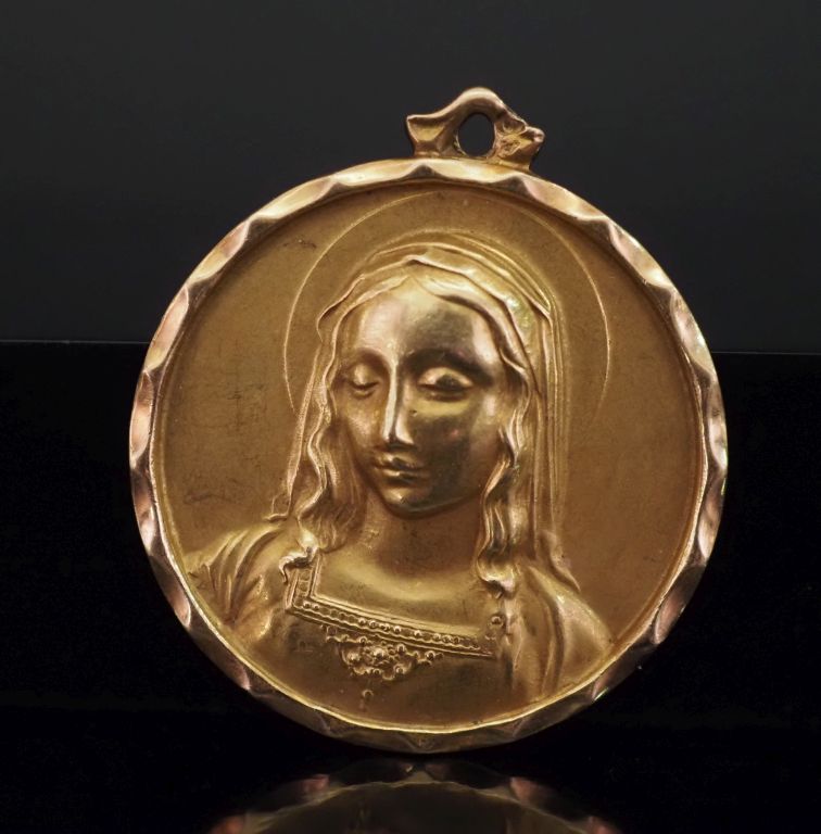 Importante médaille religieuse en or jaune 585, figurant la Sainte Vierge en buste. Diam. 3,2 cm Poids. 7,58 g
