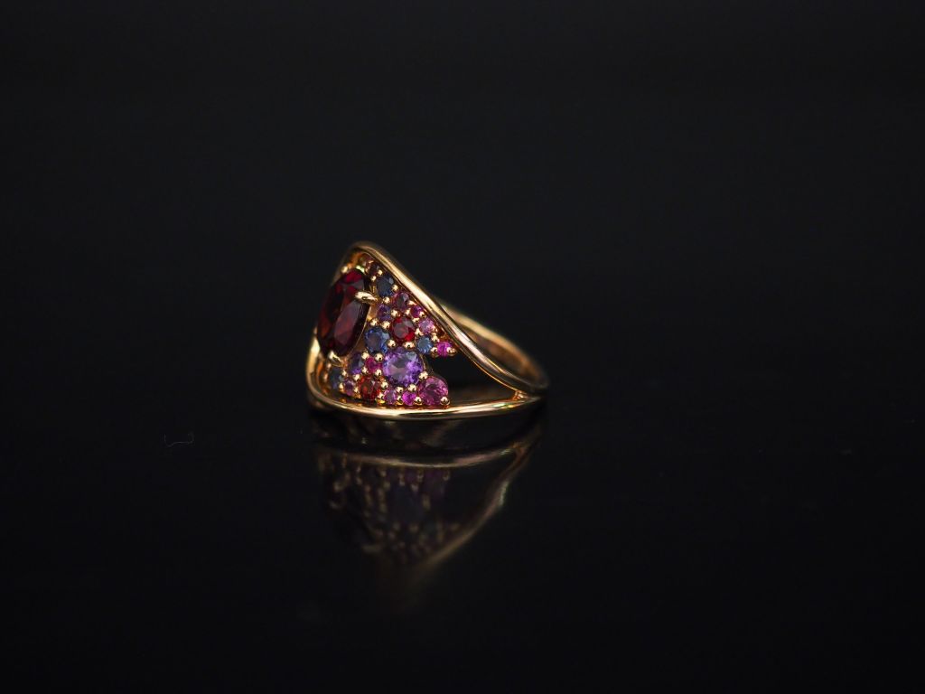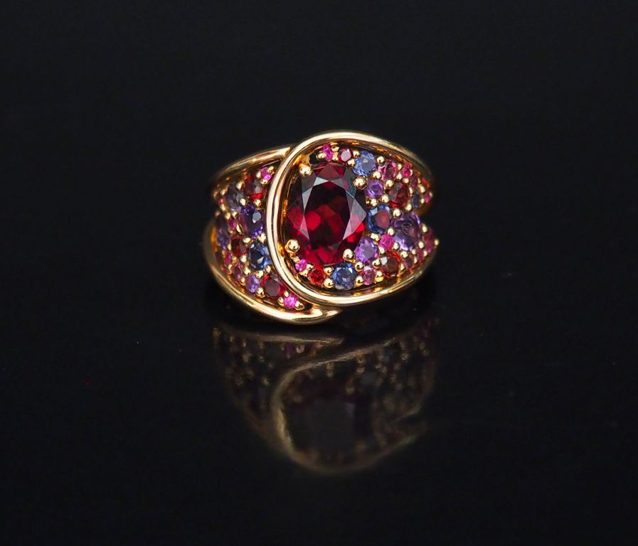 ISABELLE LANGLOIS Bague de forme stylisée en or rose, sertie de pierres de couleur. Signée. TDD. 50 Poids tel. 8,91 g