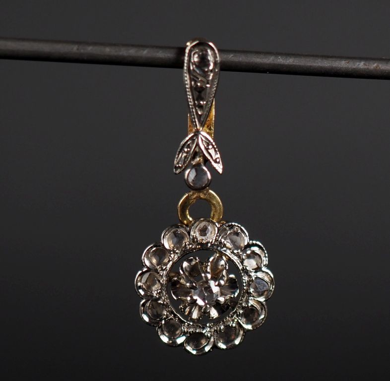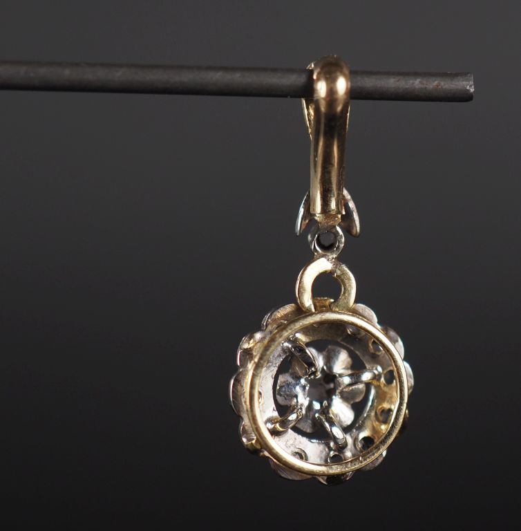 Joli pendentif en or jaune 750, à décor d'un motif de fleur en pendeloque et serti de pierres à l'imitation du diamant. H. 2,2 cm Poids tel. 1,22 g (à charge de contrôle)