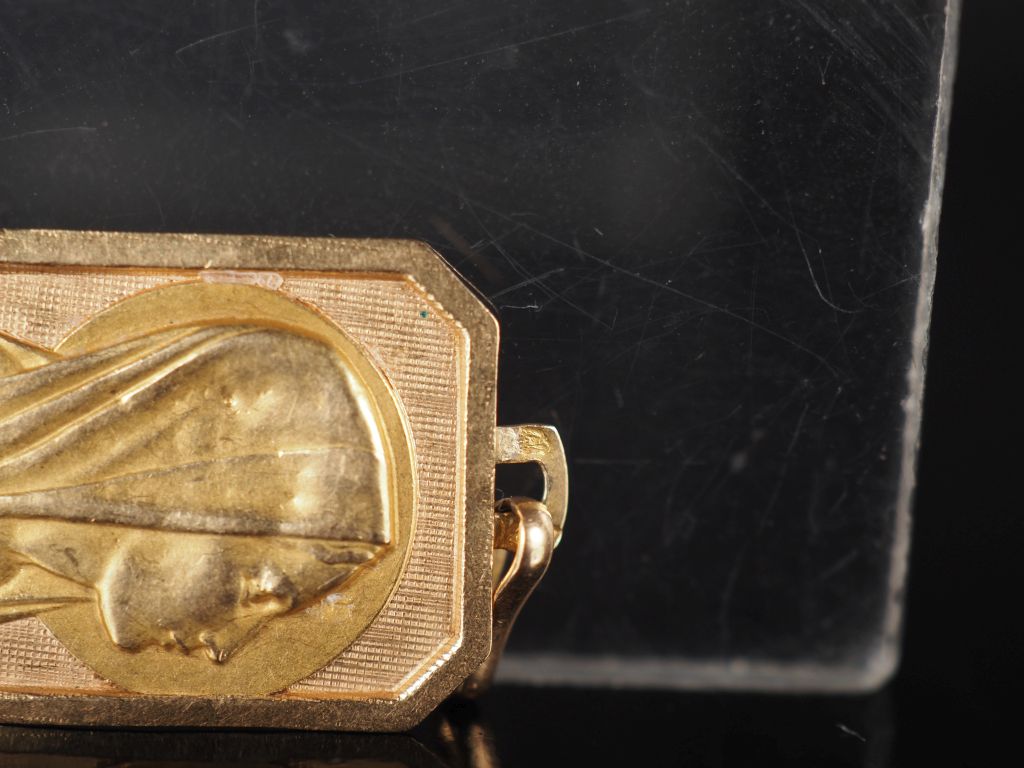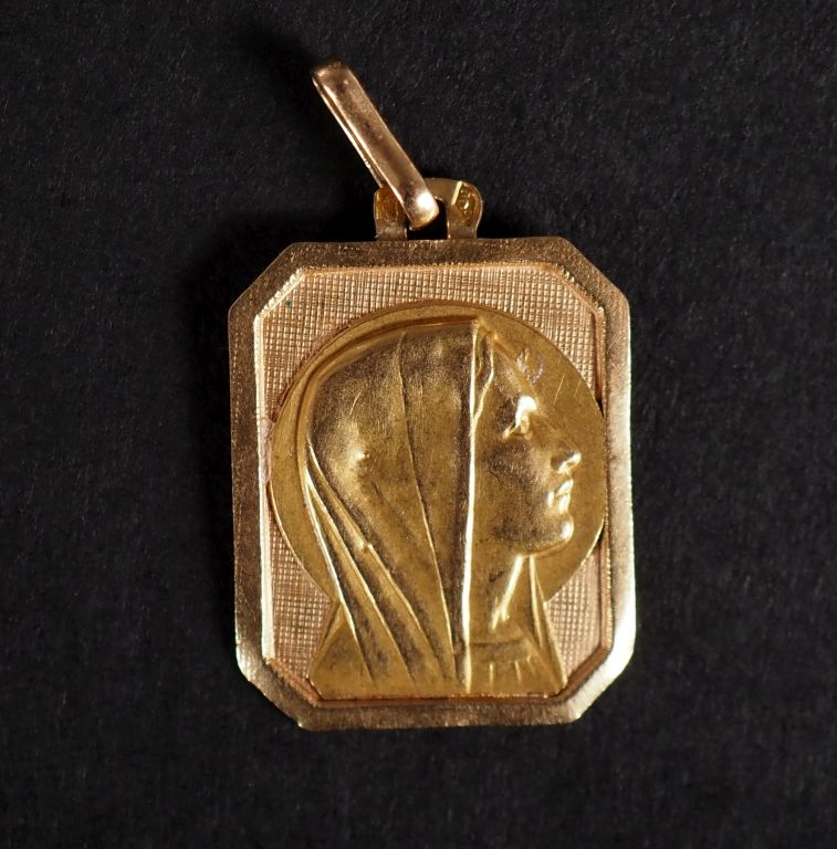 Jolie médaille de baptême en or jaune 750, de forme hexagonale, figurant la Sainte Vierge de profil. 1,8 x 1,5 cm Poids. 1,35 g (petits enfoncements)