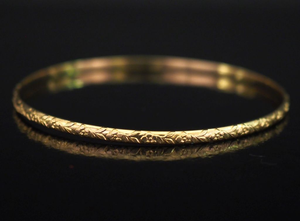 Jonc en or jaune 750, à décor de fleurs et feuillage. Diam. 6,5 cù Poids. 8,75 g (légèrement tordu)