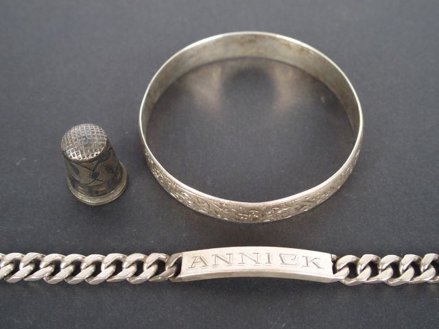 Jonc, gourmette et dé à coudre, l'ensemble en argent. Poids: 58,8gr