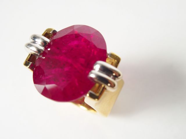 KRIA. Bague de style Art Déco monture or jaune travaillée, ornée d’un rubis synthétique de 23 x 17,5 x 10,1mm. TDD 55 Poids tel : 29,7gr