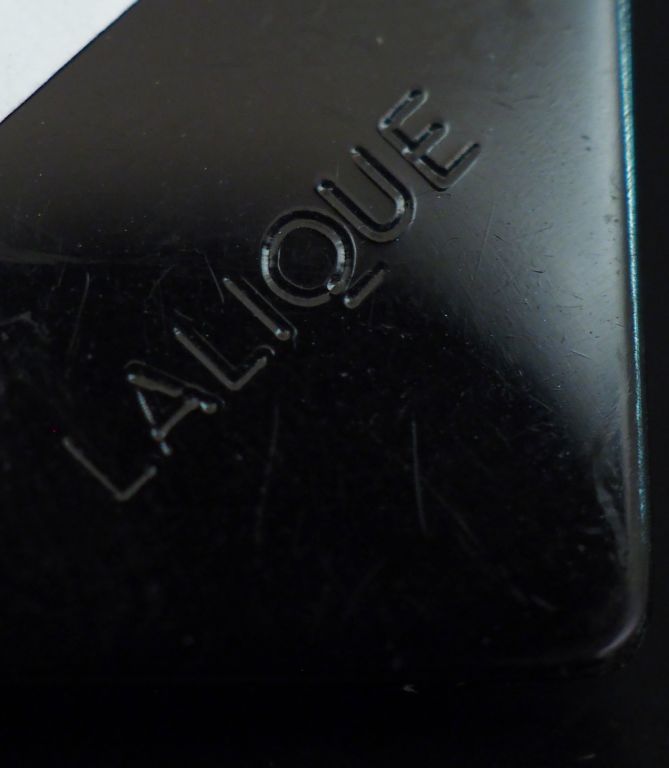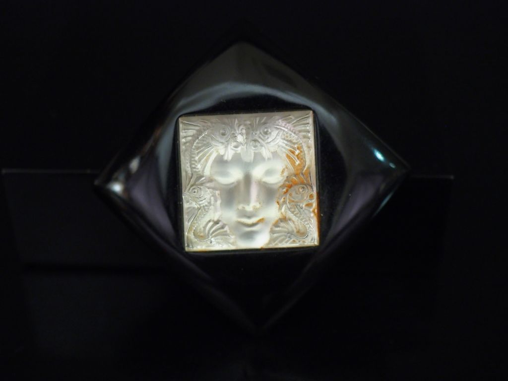 LALIQUE Broche en forme de losange en verre noir centrée d'un motif de tête de femme en verre blanc. Signée. 5 x 5 cm