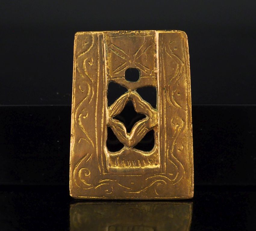 Line VAUTRIN Pendentif de forme trapézoïdale en bronze doré, à décor ajouré et gravé. Signé. 4 x 3 cm
