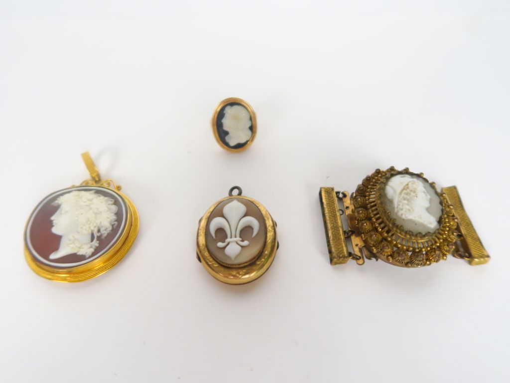Lot comprenant : - une broche camée pierre dure XIXème "Profil de jeune femme", monture or jaune. Poids tel. 13,62 gr - et une bague XIXème ornée d'un camée "Profil de jeune femme", monture or 14k. Poids tel. 4,90 gr On y joint un pendentif Napoléon III porte-photo en métal doré et camée à décor de fleurs de lys, une partie de bracelet XIXème en pomponne et camée à décor de profil de jeune femme. (accident)