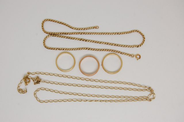 Lot d'or composé de 3 alliances et deux chaines. Poids : 26,28 g