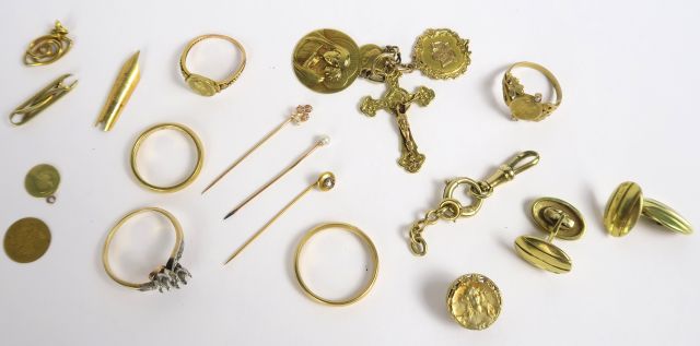 Lot d’or comprenant des médailles et croix, alliances, plumes, bagues et montures de bague, boutons de manchettes, partie de giletière. Poids : 48 g. On y joint trois épingles de cravates ornées de perles et de roses (celle avec la perle en métal doré)
