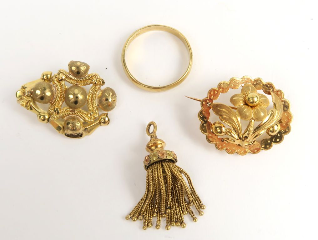 Lot d'or comprenant une broche, une alliance, un pendentif en forme de pompon, une partie de broche. Poids : 13,4 g