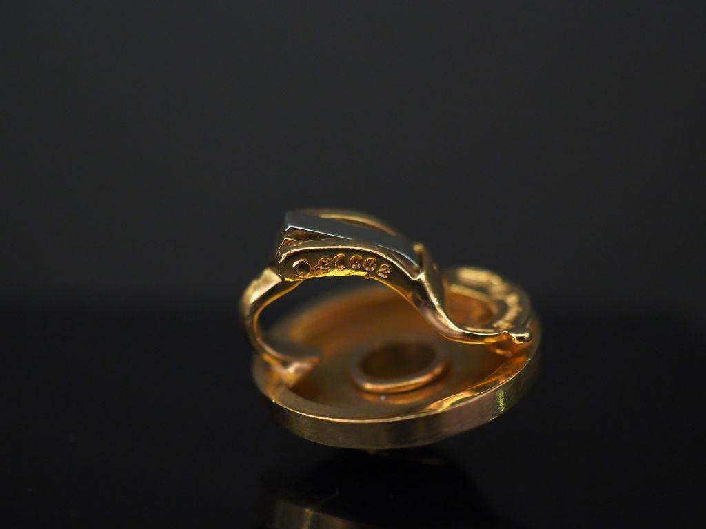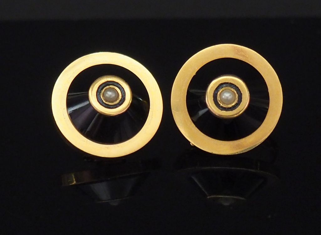 MARINE B. Paire de clips d’oreilles en or jaune, onyx et émail noir, sertis en leur centre d’une perle. Diam. 2 cm Signée. Numérotés. Poids tel. 11,26 g