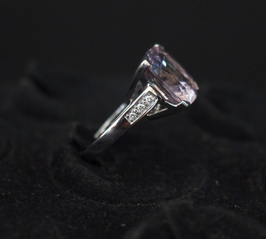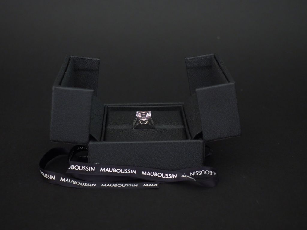 MAUBOUSSIN Bague en or blanc, sertie en son centre d'une pierre rosée épaulée de deux lignes de trois petits diamants. Signée. TDD. 51 Poids tel. 7,15 g Dans son écrin.